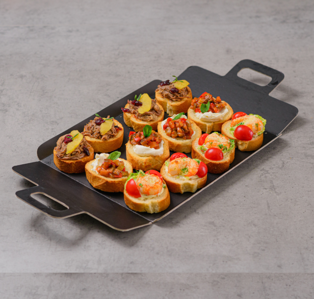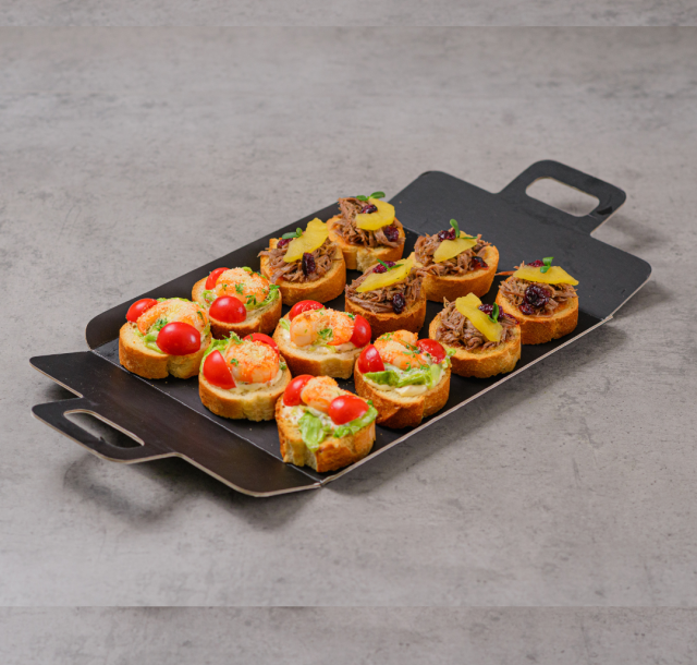 Брускетты с уткой и пряным яблочным конфитюром 6 шт и с креветкой и французским соусом 6 шт.