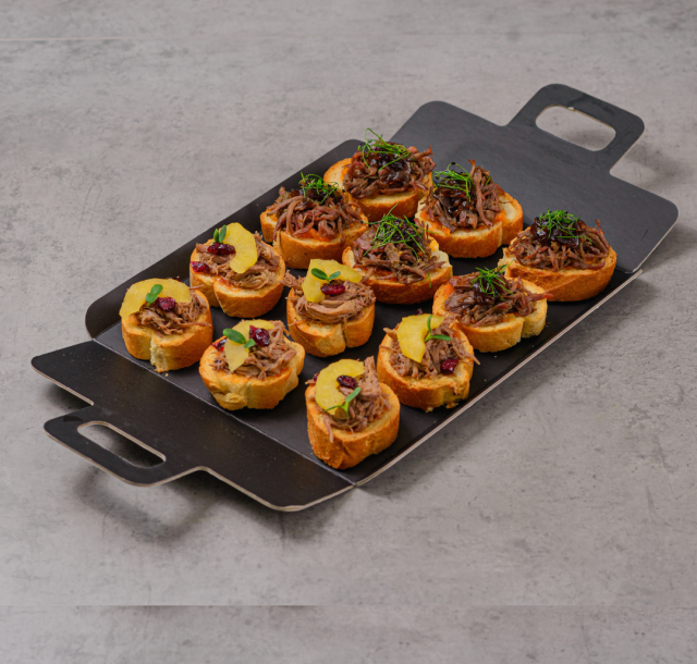 Брускетты с уткой и пряным яблочным конфитюром 6 шт и с рваной говядиной, карамел луком и дом.аджикой 6 шт.