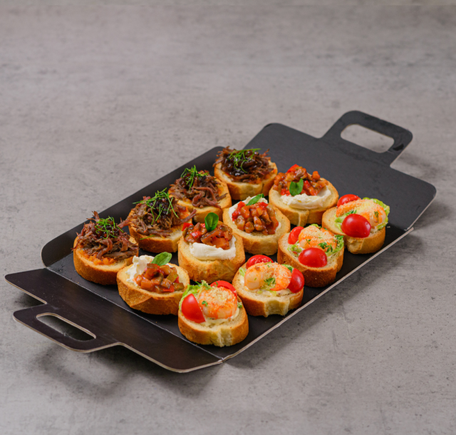 Брускетта с уткой и пряным яблочным конфитюром 4 шт, с овощным сотте и базиликом 4 шт, брускетта с креветкой и французским соусом 4 шт.