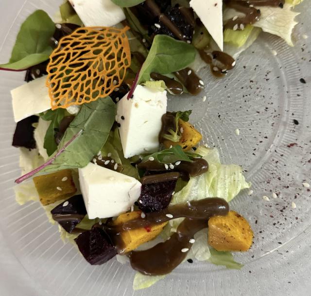 (свекла, тыква, корень сельдерея, микс салат, заправка бальзамическая, сыр рассольный, семена кунжута)
