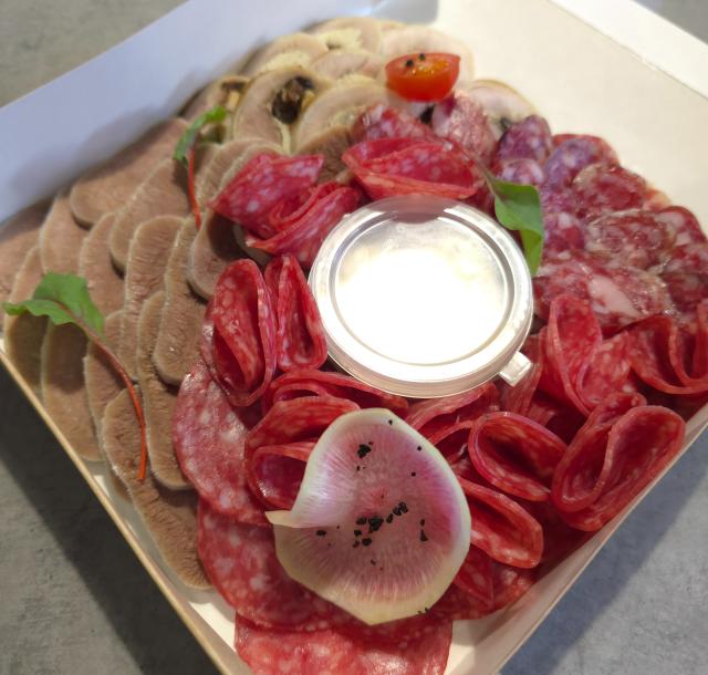 Руляда с черносливом и омлетом, язык говяжий отварной, салями, домашняя колбаса с/в, французский соус, зелень.