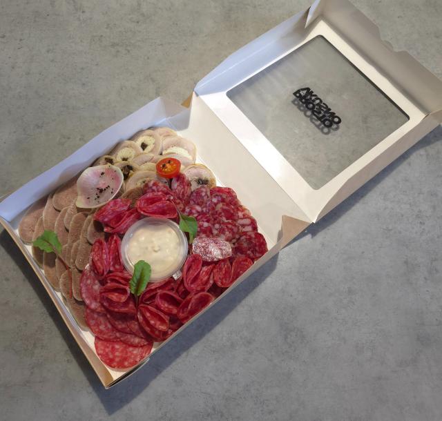 Рулет из рульки с черносливом и омлетом, язык говяжий отварной, салями, домашняя колбаса с/к,французский соус, зелень.