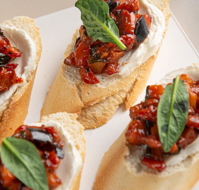 Брускетта с овощным сотте и базиликом : хрустящий багет, сотте из баклажана, цуккини, болгарского перца и томата с базиликом и мягким сыром.