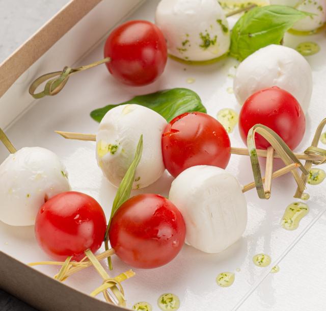 Лёгкая закуска в стиле итальянской закуски «Капрезе» с моцареллой, черри и соусом песто.