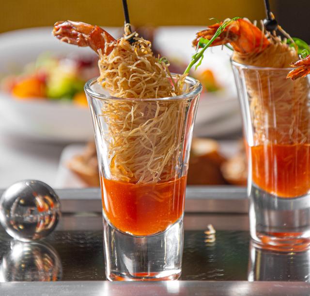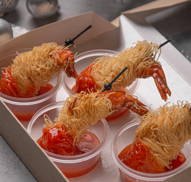 Креветки королевские, тесто катаифи, кисло-сладкий китайский соус.