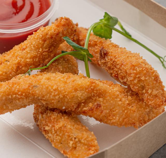 Это не те, куриные нагетсы,которые вы часто встречаете в кафе или доставках. Мы их делаем сами - сочное куриное филе в панировке из сухарей панко, с соусом с кетчупом.