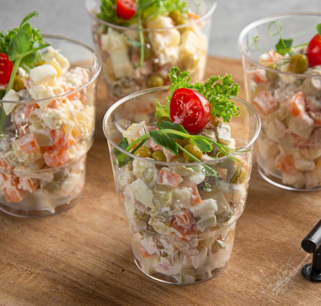 Состав: копченая курица, горошек, огурец маринованный, картофель,морковь, яйцо, майонез, зелень.