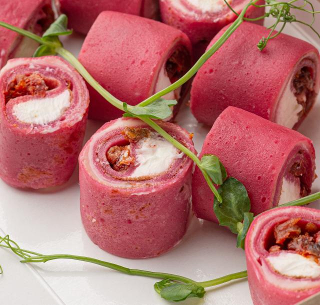 Интересная закуска не только по вкусу, но и цвету. Состав: классический тонкий блинчик с добавлением свекольного сока, вяленные томаты, сыр творожный.