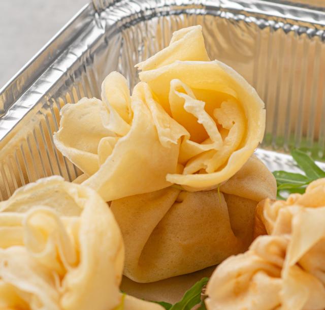 Нежный куриный жульен, подаётся в мешочке из тонкого блинчика, украшенный зеленью.